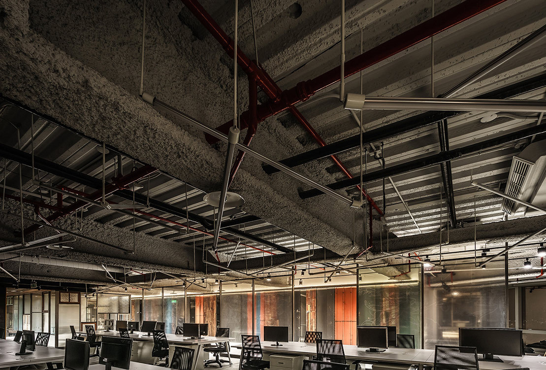 辦公室裝修設計公司讓空間內以一種富于能量的形式展開(kāi),于主動(dòng)線(xiàn)拉出一道長(cháng)達20米的廊道,并以開(kāi)放、穿透的手法讓點(diǎn)、線(xiàn)、面與軸線(xiàn)在此匯聚,形構空間張力與視覺(jué)沖擊。